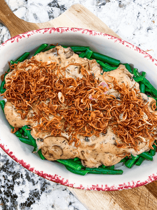 Green bean casserole is traditionally heavy and very rich. This year, try switching things up by adding a lighter option to your Thanksgiving table! Fresh green beans and a lighter mushroom gravy make this recipe much easier to fit into any weight loss plan, and the crispy shallots are a perfect substitute for traditional french-fried onions.
